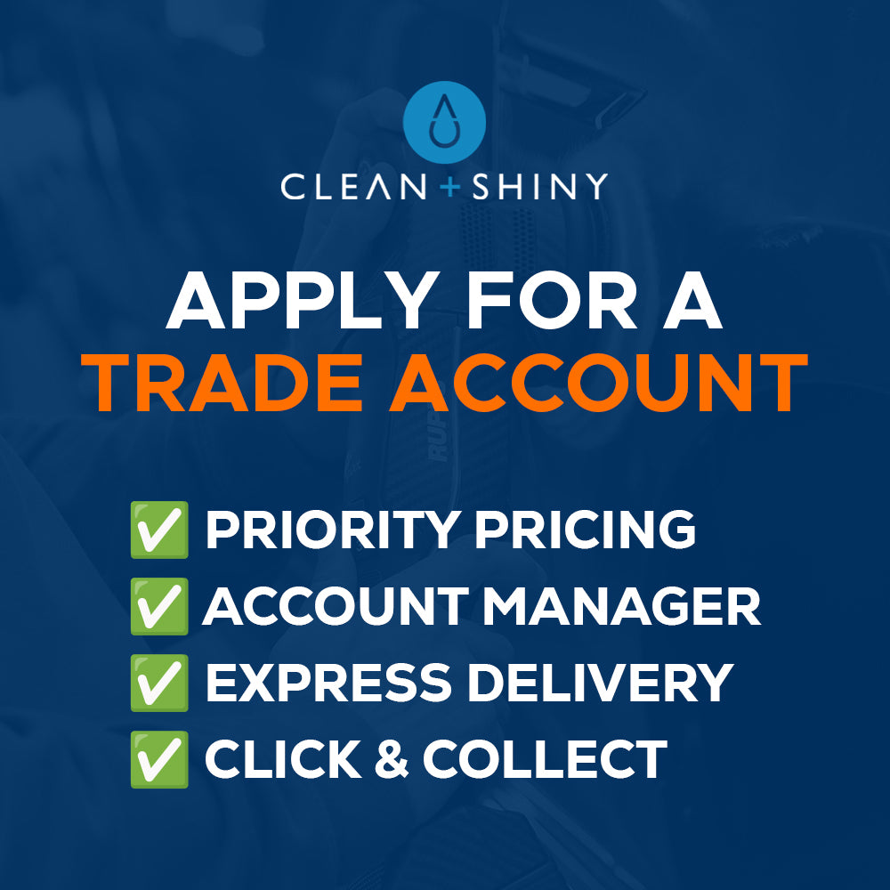 Detailing professionals: Unlock instant savings with a Clean + Shiny Trade Account and access market-leading discounts on all supplies.