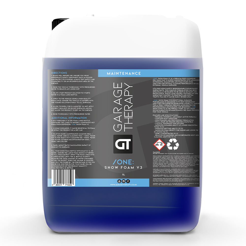 Garage Therapy /ONE: Snow Foam V3 is a high performance snow foam pre-wash designed to safely loosen and remove traffic film, road grime and heavy contamination before contact washing. Its powerful yet non-caustic formula delivers thick, clinging foam while remaining gentle on paintwork, waxes, sealants and ceramic coatings.