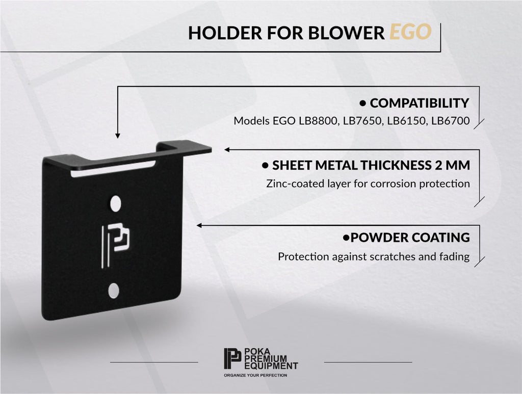 The practical and durable holder designed specifically for EGO blowers is an essential accessory for anyone who values order, safety, and efficiency in their workspace or garage. Perfectly tailored to fit models LB8800, LB7650, LB6150, and LB6700, it provides secure and stable storage, protecting your equipment from accidental damage. Built from premium 2 mm thick steel, galvanised for outstanding rust resistance, and finished with a durable powder coating, this holder ensures exceptional longevity even under intensive use.